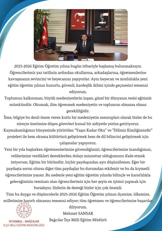 İlçe milli eğitim müdürümüz sayın Mehmet SANSAR'ın 2025-2026 Eğitim Öğretim Yılı Açılış Mesajı.